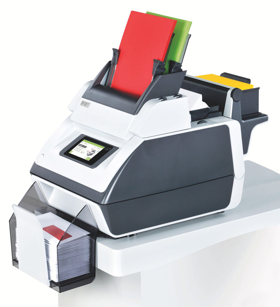 Als unser kleinstes Kuvertiergerät falzt die FPi 700 bis zu fünf Blatt Papier und kuvertiert bis zu 1.350 Briefe pro Stunde – in die Kuvert-Formate C6/5 und C5.